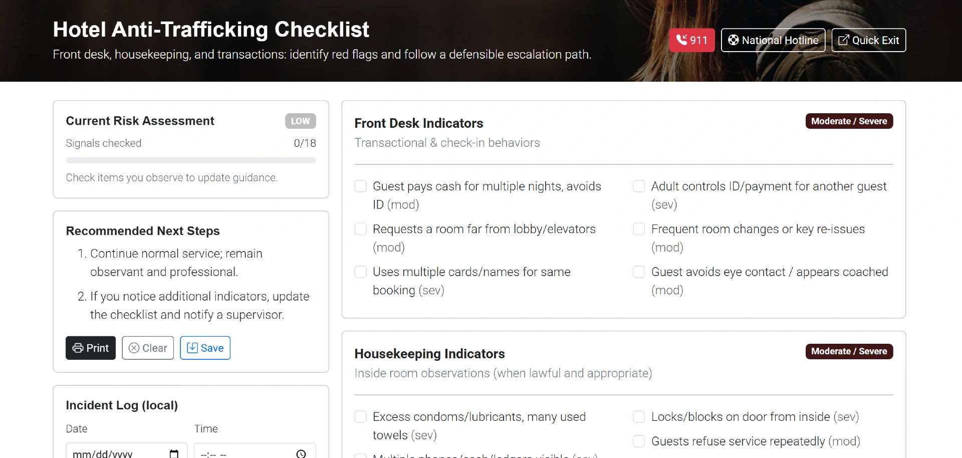 Practical, printable tools for hotels, schools, parents, healthcare teams, rideshare drivers, and more—built with ONEKID to spot red flags and act safely.